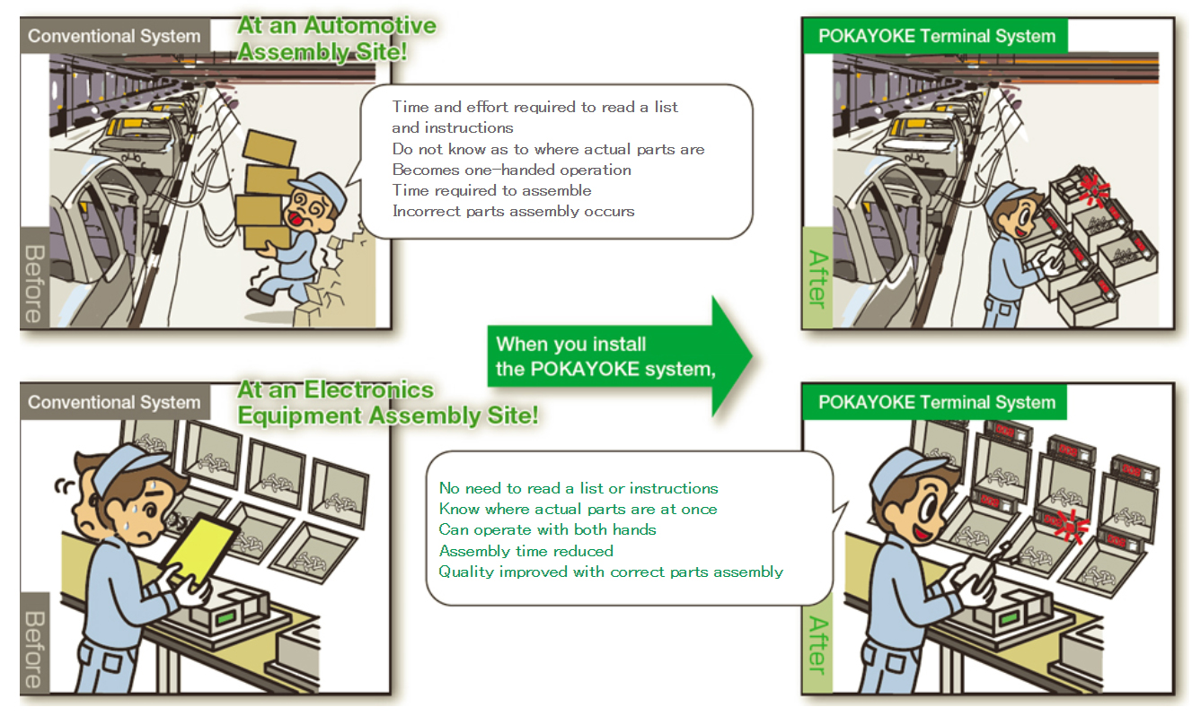 “POKA-YOKE” is a global common word การควบคุมข้อผิดพลาดของมนุษย์ในการทำงานหยิบชิ้นส่วนเป็นองค์ประกอบที่จำเป็นสำหรับการเพิ่มและปรับปรุงประสิทธิภาพการผลิตและคุณภาพของผลิตภัณฑ์ ระบบและอุปกรณ์เพื่อป้องกันข้อผิดพลาดที่เกิดจากความประมาทของมนุษย์ (poka) เรียกว่า “POKA-YOKE” และในปัจจุบันบางไซต์การผลิตในต่างประเทศได้นำคำภาษาญี่ปุ่น “POKA-YOKE” มาใช้ เพื่อบ่งบอกถึงความสำคัญของความท้าทายในการผลิตนี้