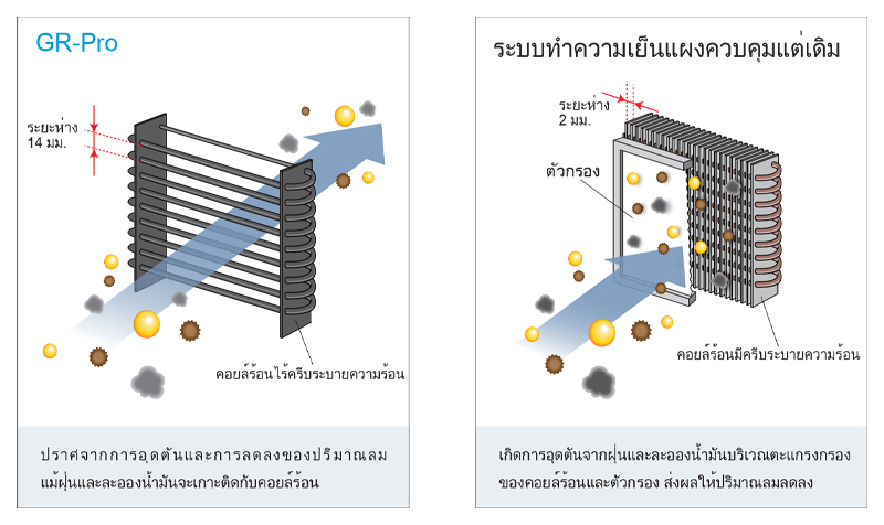 คอยล์ร้อนไร้ครีบระบายความร้อนในซีรีส์ GR-Pro มีระยะห่างท่อทองแดงประมาณ 14 มม. มีโครงสร้างที่ก่อให้เกิดการอุดตันจากฝุ่นและละอองน้ำมันได้ยาก ครีบระบายความร้อนอะลูมิเนียมของคอยล์ร้อนแต่เดิมมีระยะห่างประมาณ 2 มม. ทำให้สิ่งแปลกปลอมที่ดูดเข้าไปเกิดการอุดตันอยู่ตลอดเวลา