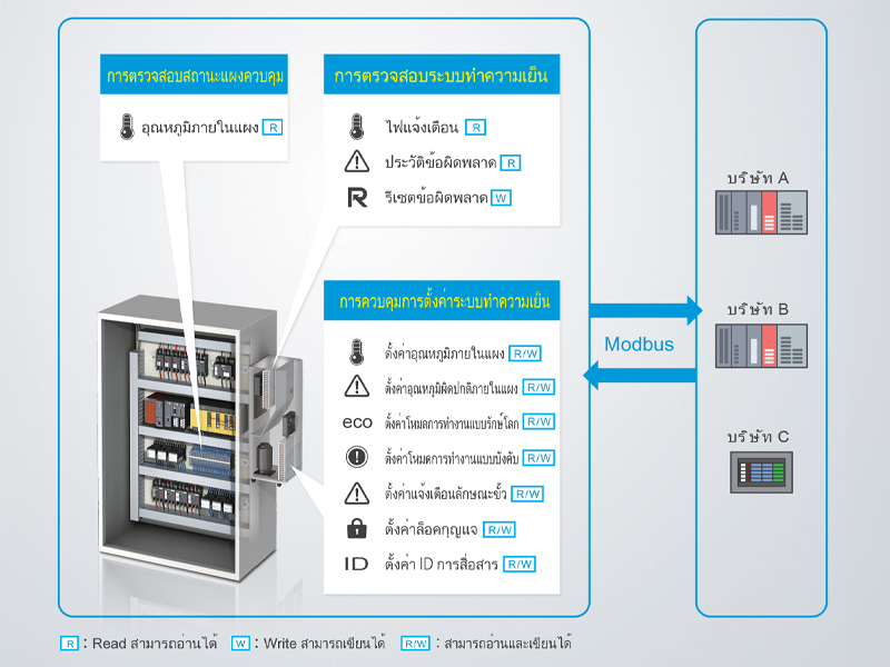 ระบบสื่อสารภายนอกเพื่อตอบสนองต่อการอ่านและเขียน จึงทำการติดตั้งระบบสื่อสารภายนอกเพื่อตอบสนองต่อการอ่านเขียนและระบบสื่อสาร Modbus/RTU (RS-485) บนระบบทำความเย็นแผงควบคุมเป็นอุปกรณ์มาตรฐาน สามารถเชื่อมต่อได้ถึงสูงสุดถึง 32 เครื่องต่ออุปกรณ์ควบคุม 1 เครื่อง อีกทั้งยังสามารถตรวจสอบอุณหภูมิแบบรวมศูนย์หรือเปลี่ยนการตั้งค่าจากหน้าจอสัมผัสและ PLC ฯลฯ ได้อีกด้วย